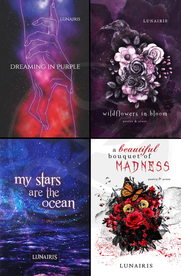 Her four published poetry collections: Dreaming In Purple (2018), Wildflowers In Bloom (2019), My Stars Are The Ocean (2019), and A Beautiful Bouquet Of Madness (2021), have been read worldwide and are available for purchase on Amazon and online at www.lunairispoetry.com.